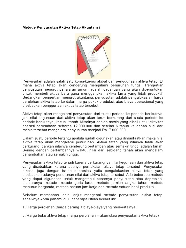 Penyusutan aktiva tetap perlu dihitung dan dicatat agar laporan laba rugi perusahaan semakin akurat. Nilai aktiva tetap akan menjadi berkurang karena adanya pemakaian aktiva tetap tersebut sehingga dalam akuntansi dikenal dengan penyusutan aktiva tetap. Guru mampu menjelaskan cara pengerjaan dari metode penyusutan aktiva tetap dengan jelas kepada. Demikianlah tadi metode penyusutan aktiva tetap. Maka jurnal penyusutannya adalah sebagai berikut: Pencatatan jurnal untuk penghentian aktiva tetap jika memperoleh. Untuk menghitung penyusutan fiskal, setiap aktiva tetap harus dikelompokkan. Masa manfaat aktiva tetap sesuai dengan kelompok aktiva tetap yang ditentukan oleh menteri keuangan. Dalam perusahaan setiap aktiva tetap apabila dijual kembali pasti akan mengalami penyusutan. Sebelum masuk kedalam pembahasan, anda perlu mengetahuinya juga kalau metode penysutan ini terdiri dari beberapa metode antara lain yaitu Karakteristik aktiva tetap, harga perolehan aktiva tetap, kriteria aktiva tetap, penyusutan aktiva tetap, contoh soal aktiva tetap pengertian aktiva tetap. Metode penyusutan garis lurus (straight line depreciation method). Semua jenis aset tetap, kecuali tanah, akan makin berkurang kemampuannya untuk memberikan jasa bersamaan dengan.