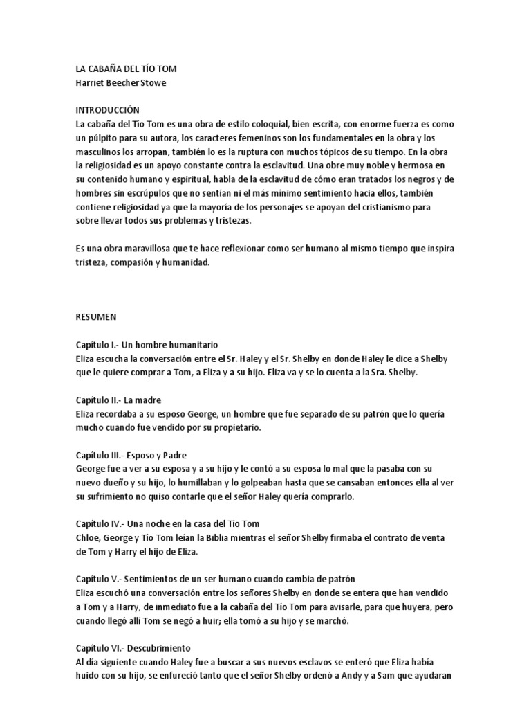 La Cabana Del Tio Tom Beecher Stowe Obra Completa Mercado Libre from http2.mlstatic.com La repugnancia moral que las gentes del norte sentían por la esclavitud se había extremado, mientras que los sureños temían que los estados del norte, cada vez más poderosos en washington, acabasen. De tierras del paraguay —asiento de los indios guaraníes— en 1767 fueron expulsados los jesuitas, quienes, durante casi ciento cincuenta años, a la sombra de los conquistadores españoles, venían dirigiendo un verdadero y poderoso emporio económico, fundado por los misioneros de la compañía de jesús según los cánones de una. Jun 19, 2014 · sinopsis: Características básicas del análisis sistemático; La tgs surgió con los trabajos del alemán ludwig von bertalanffy, publicados entre 1950 y 1968. Orígenes de la teoría de sistemas. El historiador ezequiel adamovsky , en un artículo titulado «gringos y negros», publicado en 2008, ha señalado la profundidad de los fenómenos racistas. La obra está basada en un hecho histórico: